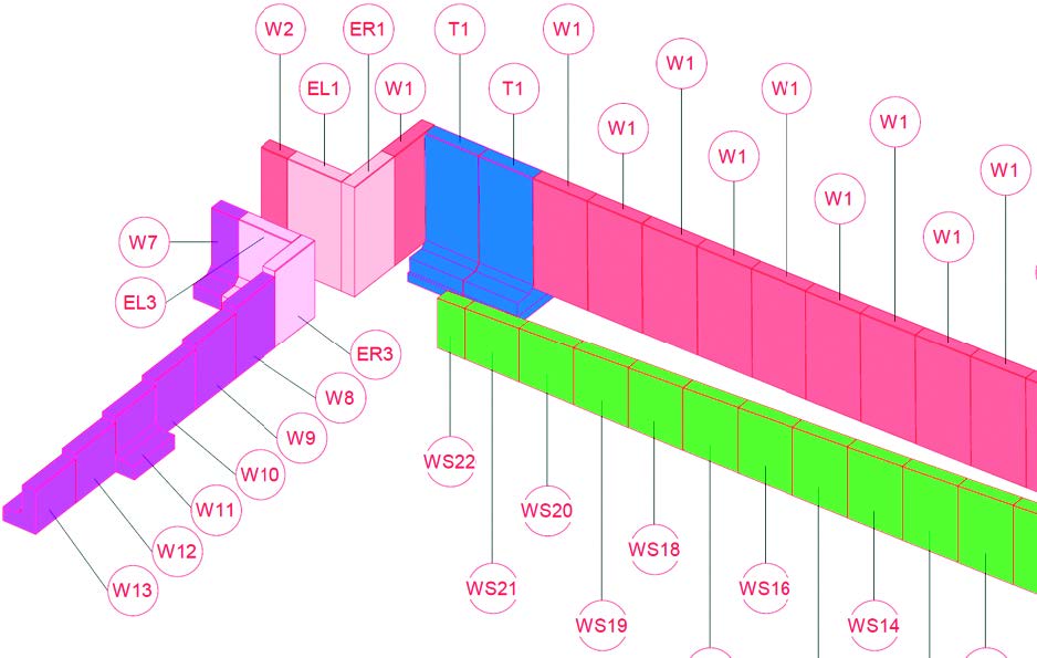 Die genehmigungsfähigen Ausführungspläne wurden aus dem Modell abgeleitet und mit Beschriftungen und Bemaßungen ergänzt. Zusätzlich wurden für den Einbau der Winkelstützwände detaillierte Arbeitspläne mit 3D-Visualisierungen und Farbcodierungen erstellt, um Verwechslungen auf der Baustelle zu vermeiden (Abbildung 2). Aus den Modellen heraus erfolgte zudem eine umfangreiche Mengenermittlung von Bauteillisten für die Materialbestellung. Der Zugriff für alle Projektbeteiligten auf die Bauwerksmodelle, Pläne und weiteren Unterlagen wurde über eine vom AG bereitgestellte CDE sichergestellt.