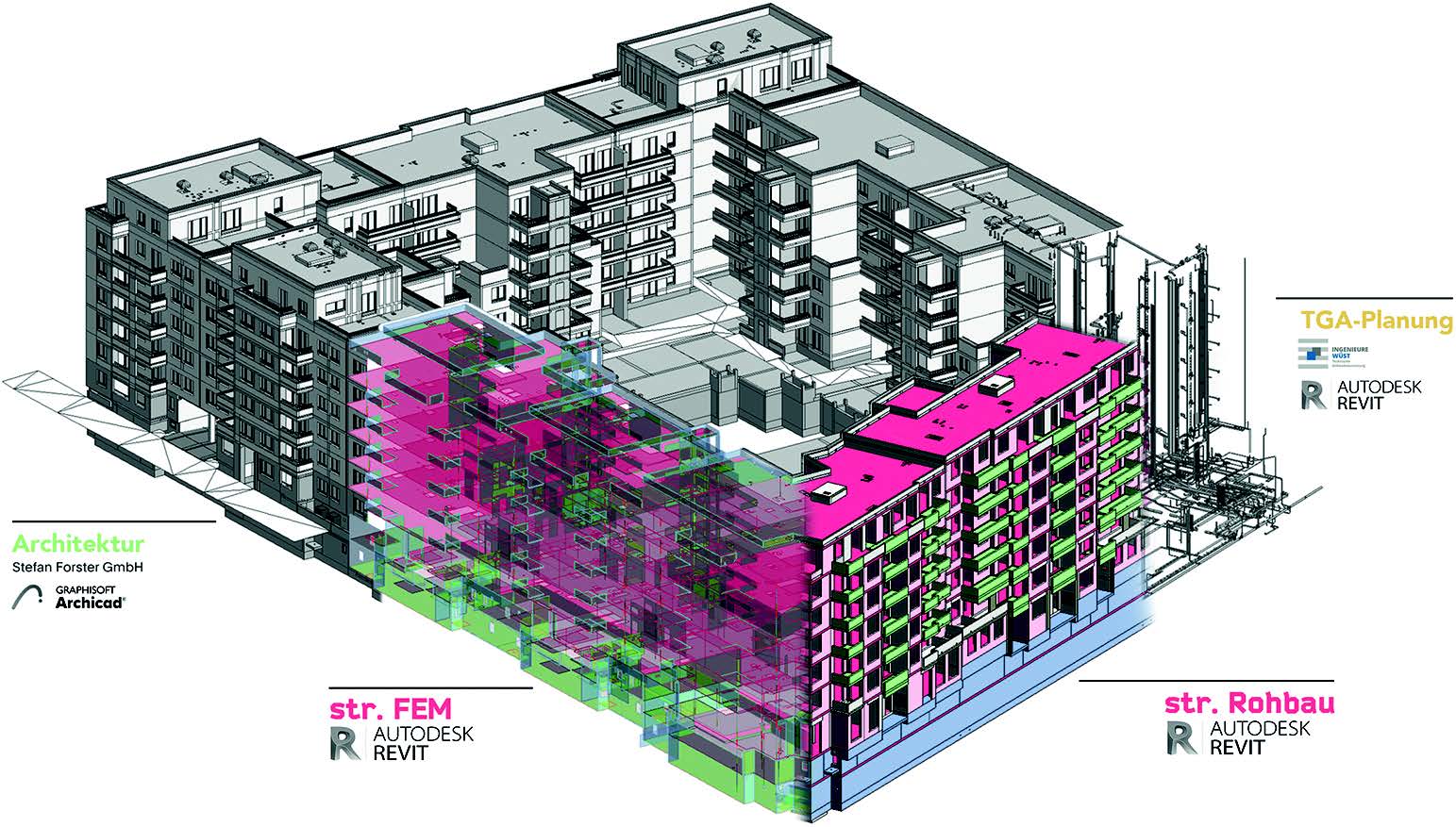 In Lean-Denkweise wurde die Planung dann von den Baustellentakten her rückwärts gedacht und haus- und geschossweise in korrespondierende Planungsabschnitte unterteilt. In einem gemeinsamen Produktionsplan wurden dann alle Planungs- und Koordinationsschritte tagesgenau festgelegt und verfolgt.