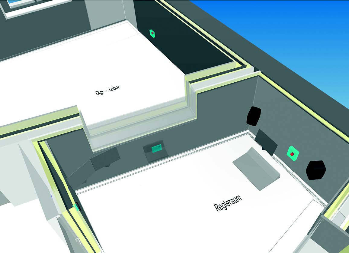 In Abbildung 3 wird beispielhaft gezeigt, wie die rote Schnittstellentechnik der TGA-Elektrotechnik in den hellblauen Schnittstellenkörpern der Medientechnik liegt. Somit wird gewährleistet, dass im dargestellten Regieraum alle Komponenten der Medientechnik korrekt angeschlossen werden können. Dies gilt auch für alle weiteren Planer, die bei der Digitalisierung eingebunden sind, wie z. B. Netzwerktechnik (Übergabepunkte an die Access Points), digitale Hinweisbeschilderung oder auch die Übergabepunkte an die Induktionshörschleifen für Gehörlose.