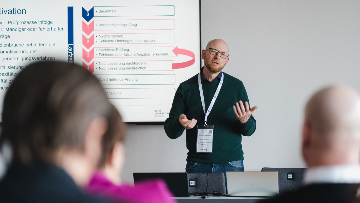 Genau, aber das ist ein anderes Thema, das man klar trennen muss. Auf der einen Seite gibt es den digitalen Kommunikationsprozess, bei dem Dateien über ein Portal eingereicht werden. In unserem Projekt geht es nun um die Einreichung und Prüfung von BIM-Modellen. Wir wollen also auch den Prüfprozess digitalisieren. Wenn ein BIM-Modell vorliegt, kann eine automatische Prüfung der Inhalte durchgeführt werden. Im Moment ist dieser Prüfprozess nicht möglich, weil man eine PDF-Datei bekommt, die vielleicht eingescannt ist, die der Computer nicht automatisch auswerten kann. Eine PDF-Datei muss wie ein Papierplan am Bildschirm betrachtet und geprüft werden. Das beschleunigt nur die Abgabe und die Kommunikation. Mit dem Projekt wollen wir nun auch die Prüfung beschleunigen. Am BIM-Modell sollen automatisierte Prüfungen durchgeführt werden.