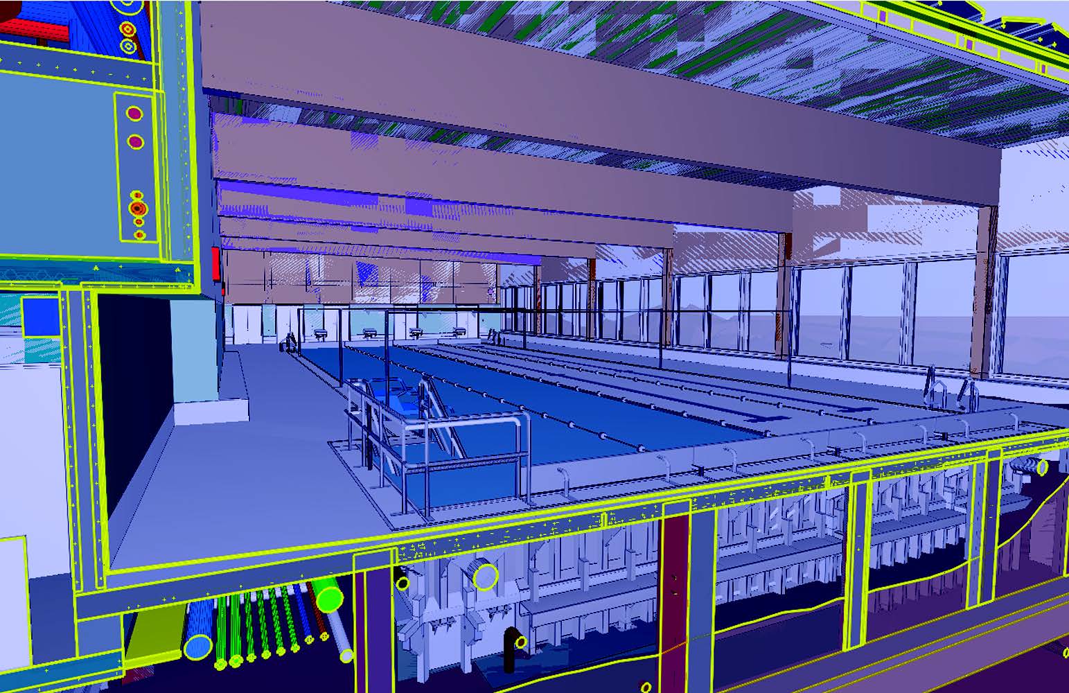 Die komplexe Orchestrierung eines Schwimmbadprojektes wie dem Sportkomplex Mohnweg konnte nur durch konsequente Anwendung der Open-BIM-Methode realisiert werden. Bereits in der Wettbewerbsphase wurden digitale Technologien wie Punktwolkenaufmaße genutzt, um eine präzise Planung zu gewährleisten. Durch den Einsatz von IFC-Daten und Kommunikation mithilfe von BCF konnte eine nahtlose Zusammenarbeit über alle Disziplinen hinweg bis in die Produktion sichergestellt werden.