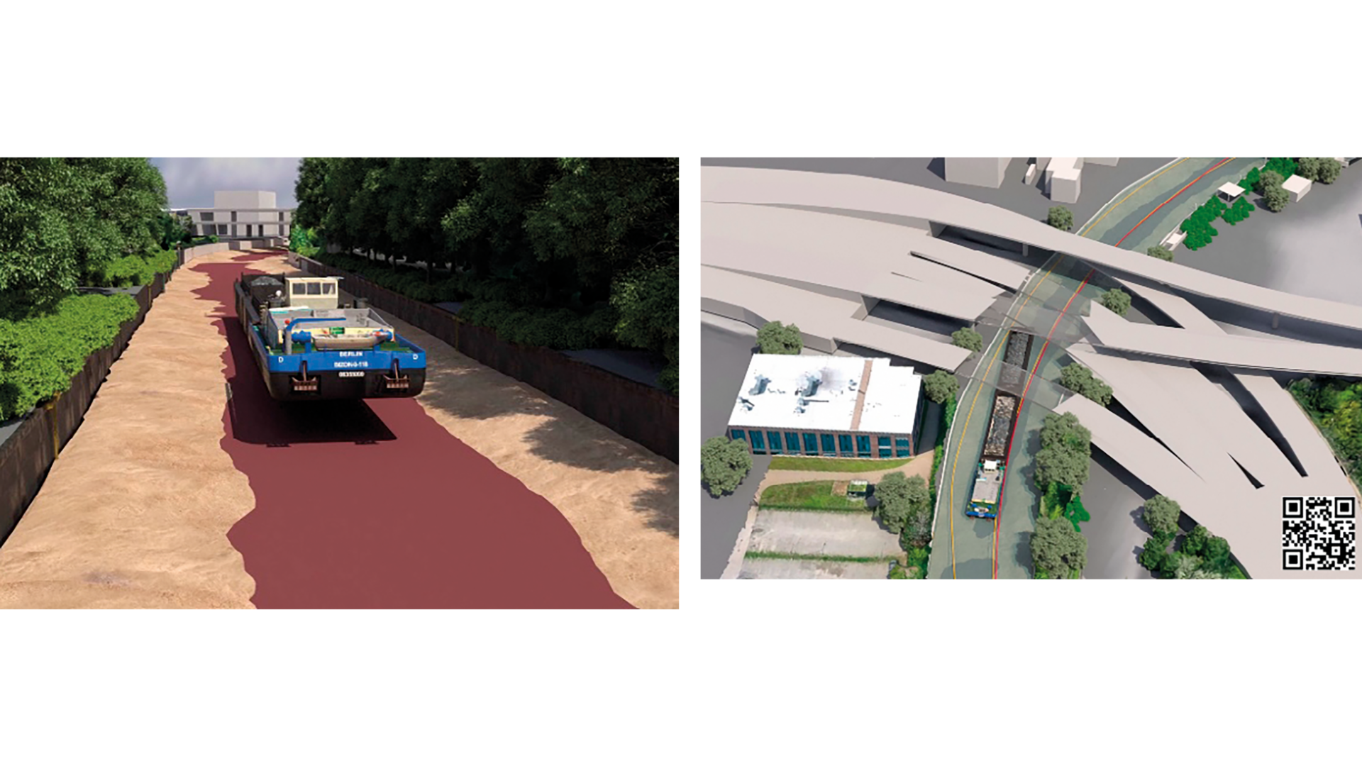 Für die Kommunikation des Projektes wurde ein auf dem Digitalen Zwilling basierender Animationsfilm erstellt. Hierbei hat sich die Integration der Umgebung, wenn auch in unterschiedlichem Detaillierungsgrad, als für die Anschauung sehr vorteilhaft erwiesen (Abbildung 4). Es wurden die Fahrten zweier Güter- und eines Personenschiffs simuliert und in den Kontext der vorhandenen Gewässergrundmorphologie sowie der Lichtraumprofile und Trassierungen gestellt.