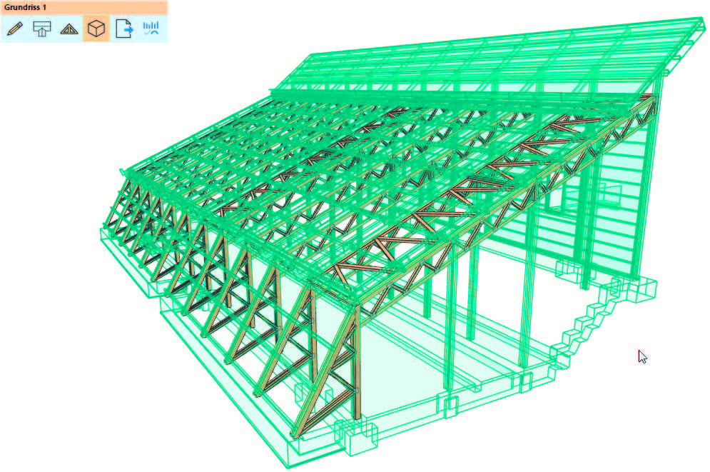 BIM-Anwendungsfall: Der Entwurf wurde als 3D-Modell erstellt und als IFC-Projekt exportiert. Auf dieser Grundlage wurden Statik und Ausführungsplanung von der MiTek Industries GmbH in Pamir erstellt. Die Ausführungsplanung wurde dann in Vectorworks reimportiert, um anhand einer überlagerten Darstellung die Ausführungsplanung zusätzlich für den Entwurf zu optimieren.