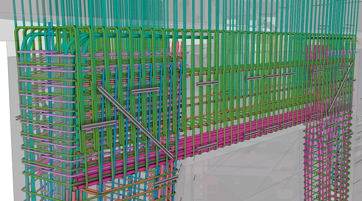 Das für die Ausführungsplanung erstellte As-to-be-built-Modell enthielt neben den Einbauteilen und der Fertigteilplanung auch die komplette Bewehrungsplanung. Dieses Modell wurde sowohl der Baustelle als auch dem Prüfingenieurin Form von geschossweise erzeugten IFCs über die CDE Trimble Connect zur Verfügung gestellt und trug als Ergänzung zu den 2D-Plänen insbesondere bei komplexen Schal- und Bewehrungsstrukturen zu einer hohen Ausführungsqualität bei.