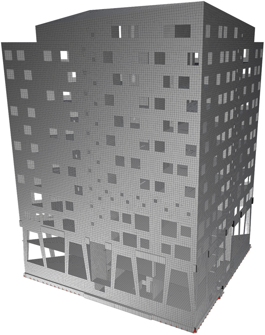 Die komplexe Aussteifungssituation des Gebäudes durch die Auflösung einer geschlossenen Fassade in Bockstützen und der dreieckige Grundriss des Gebäudes machten eine Bemessung in einem FEM-Gesamtsystem notwendig. Auch hier erfolgte die Übergabe der Struktur einschließlich der Fenstereinteilung aus dem Fachmodell über IFC an das Berechnungsprogramm.