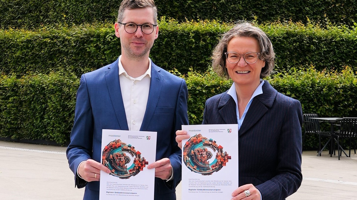 Am 29. Mai 2024 unterzeichneten Ina Scharrenbach, Ministerin für Heimat, Kommunales, Bau und Digitalisierung des Landes Nordrhein-Westfalen, und Dr. Patrick Bergmann, Geschäftsführer von Madaster Germany, eine gemeinsame Absichtserklärung, die das erklärte Ziel hat, den digitalen Gebäuderessourcenpasses in Deutschland größtem Bundesland einzuführen. So soll eine belastbare, nachvollziehbare, vergleichbare sowie dauerhaft verfügbare digitale Dokumentation über Gebäuderessourcen geschaffen werden.
